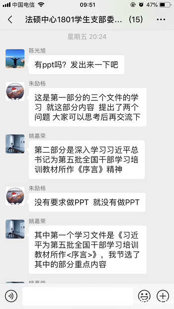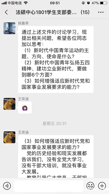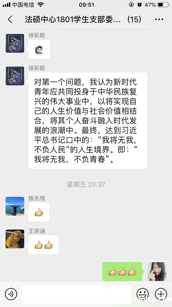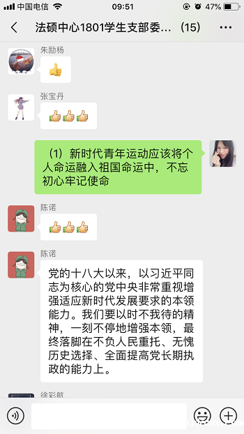 针对以上问题,四位党员同志在微信上踊跃发言。首先是王奕涵同志针对第三个问题,她谈到,党的历史经验和现实发展都告诉我们,没有全党大学习,没有干部大培训,就没有事业大发展。教育引导广大党员、干部按照忠诚干净担当的要求提高自己,努力培养斗争精神、增强斗争本领,使思想、能力、行动跟上党中央要求、跟上时代前进步伐、跟上事业发展需要,不断增强干部队伍适应新时代党和国家事业发展要求的能力。针对第一个问题,徐彩航同志认为新时代青年应共同投身于中华民族伟大复兴的伟大事业中,以将实现自己的人生价值与社会价值相结合,将其个人奋斗融入时代发展的浪潮中。最终,达到习近平总书记口中的:“我将无我,不负人民“的人生境界。即:“我将无我,不负青春”。针对第一个问题,农恒同志谈到,时代青年运动应该将个人命运融入祖国命运中,不忘初心、牢记使命。最后,陈诺同志回答道,党的十八大以来,以习近平同志为核心的党中央非常重视增强适应新时代发展要求的本领能力。我们要以时不我待的精神,一刻不停地增强本领,最终落脚在不负人民重托、无愧历史选择、全面提高党长期执政的能力上。