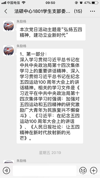 (通讯员 农恒 摄影 农恒)2019510日晚上8点,luck18平台1801班学生支部委员会开展5月份支部主题党日活动。支部全体同志参加了本次活动,活动由党支部朱励杨、姚嘉荣同志主持。本次活动形式是自主学习,线上交流。