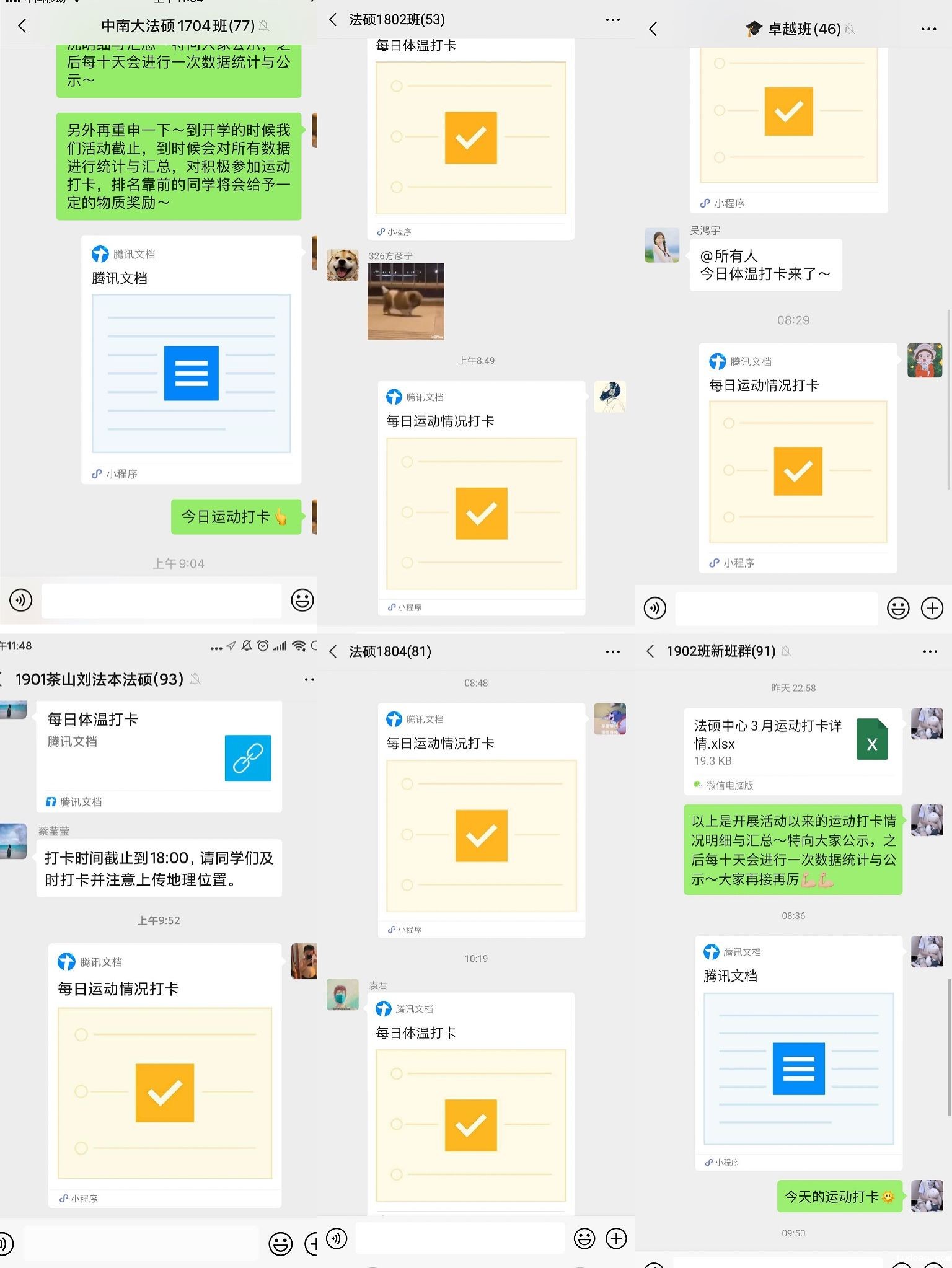 为确保每一位学生的身体健康,丰富居家学习生活,法硕中心要求各班每日自主开展体温打卡、学习打卡、运动打卡的活动。法硕学子积极参与到活动中来,严格要求自己,把“打卡”落到实处,切实达到“打卡”效果,通过“打卡”形成比、学、赶、帮、超的浓厚氛围,取得良好效果,极大地提高了线上教学质量,同时丰富了居家生活。打卡已经成为学生的自觉养成,是每天的必修课程,实现“打卡”常态化、制度化,更好地促进学生学习生活。