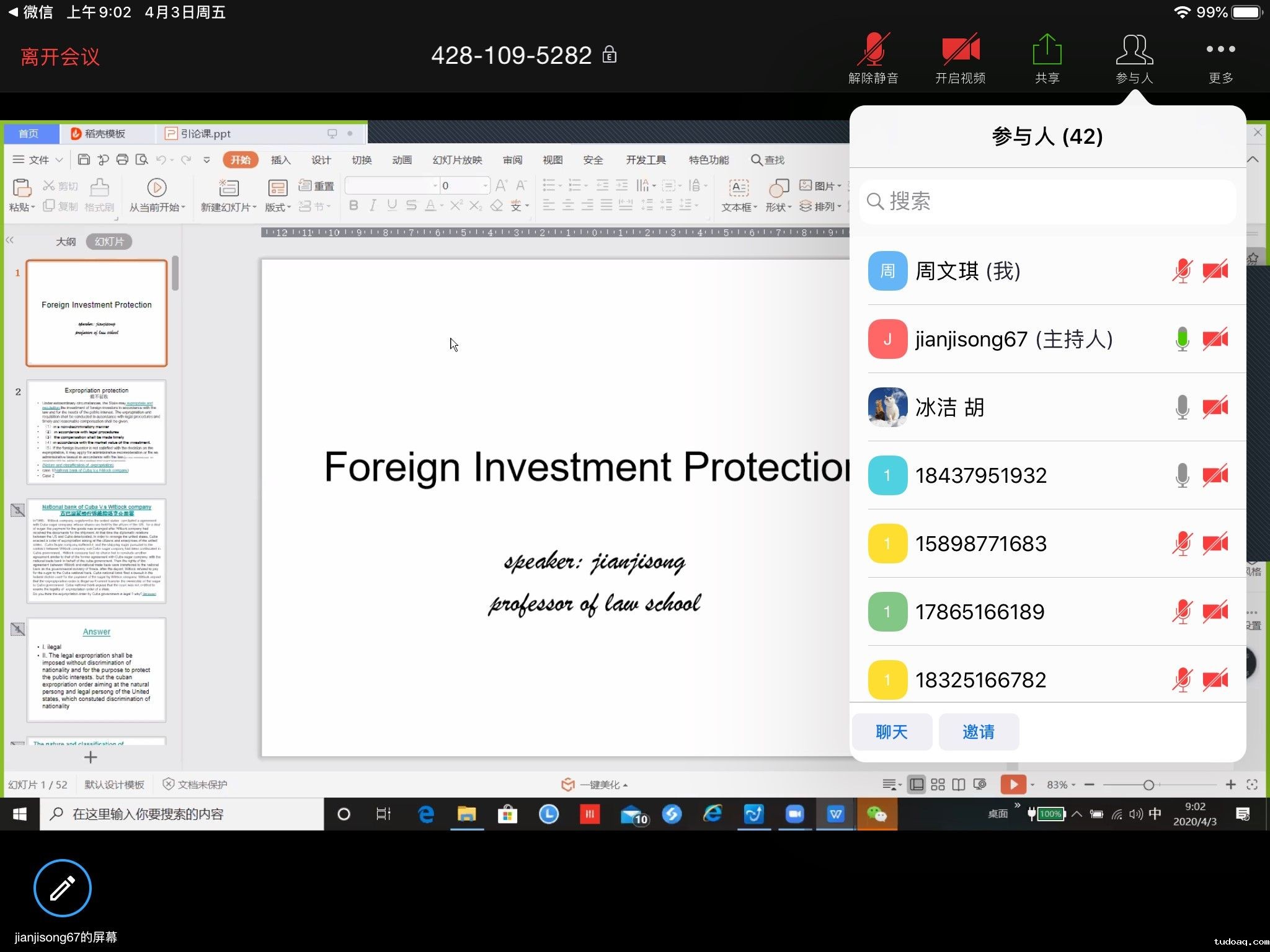 简基松老师采用全英文授课方式开展“外商投资法”的线上教学,并采用课堂提问的方式督促学生们及时预习和复习课程。首先通过一堂引论课为学生们揭开了外商投资法的神秘面纱,接着从其渊源、与其他相关法律的关系以及对外商投资的保护等方面逐步加深大家对该法的认识,理论结合实例的讲解模式也让晦涩的知识变得通俗易懂,极大地提高了学生的思维活跃度。刘建华老师为2018级学生讲授“证据调查”,依托“腾讯课堂”进行授课,建立课程微信群,及时分享新的课程内容,精心制作课件,设置课堂问题,师生互动,展开自由讨论,丰富课堂教学内容,增强学生学习效果。刘代华老师为2019级学生开启“刑法学”的线上教学之旅,用清晰的逻辑思维,独特的授课方式讲好“刑法第一课”,刘代华老师授课引经据典,同时聚焦司法实务,讲述了“许霆案”、“陆勇案”等典型案例背后的法理人情,极大地激发了学生参与课堂的积极性。尹生老师开展“国际法”线上教学,及时录制发布专题课程音频,就国际法专题热点进行介绍,并组织有关专题研讨,约定时间统一为学生解决问题。徐菊香老师为1901班授课“法律检索与论文写作”,通过QQ群确定学生选题,以问题为导向,培养学生独立思考的问题意识,学习掌握文献检索方法,提升学术素养,完成一篇文献综述与检索报告。徐小奔老师为1903班展开“专利法原理与实务”课程的线上教学活动,徐老师以其深厚的理论功底,风趣幽默的授课风格,深入浅出,赢得学生一致赞誉,学生在网络课堂上积极参与讨论问题,教学的过程性参与度较高,教学效果显著。