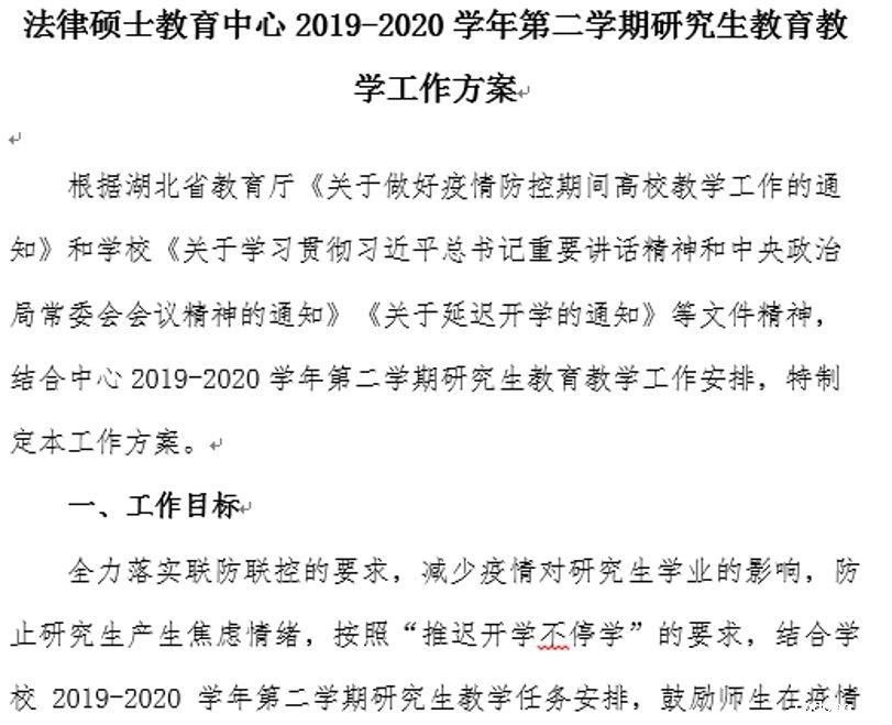 部署各项工作任务,确保教学不降标准。根据湖北省教育厅《关于做好疫情防控期间高校教学工作的通知》精神,按照“推迟开学不停学”的要求,法硕中心制定了2019-2020学年第二学期研究生教育教学工作安排计划,由刘军老师起草方案,简基松副主任负责审核。该方案对研究生国际新利官网开户流程是什么、教学工作、学位管理工作等进行了详细说明,要求研究生在特殊时期不离家、不返校,做到教师不停教、学生不停学,论文有指导、毕业有保障。既要想方设法克服困难,又要确保工作取得进展,圆满完成招生、教学、毕业生毕业三大任务。