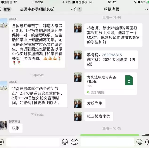 为落实教育部“停课不停教、停课不停学”的要求,满足广大学生居家学习的需要,luck18平台鼓励任课老师充分利用线上资源开展教学活动。简基松副主任在导师组微信群中叮嘱导师们保持与学生的密切联系,在生活和学业上关心学生,特别是即将毕业的学生。教学秘书杨捷老师联系多个老师开设多个线上课堂,组织学生开展线上学习。法硕中心要求辅导员和教学秘书深入课堂进行考勤,教师要严把教学质量标准关,按纲施教,课时不减,要求不松,实现教师“教”与学生“学”相统一,确保中心教学工作稳步推进。