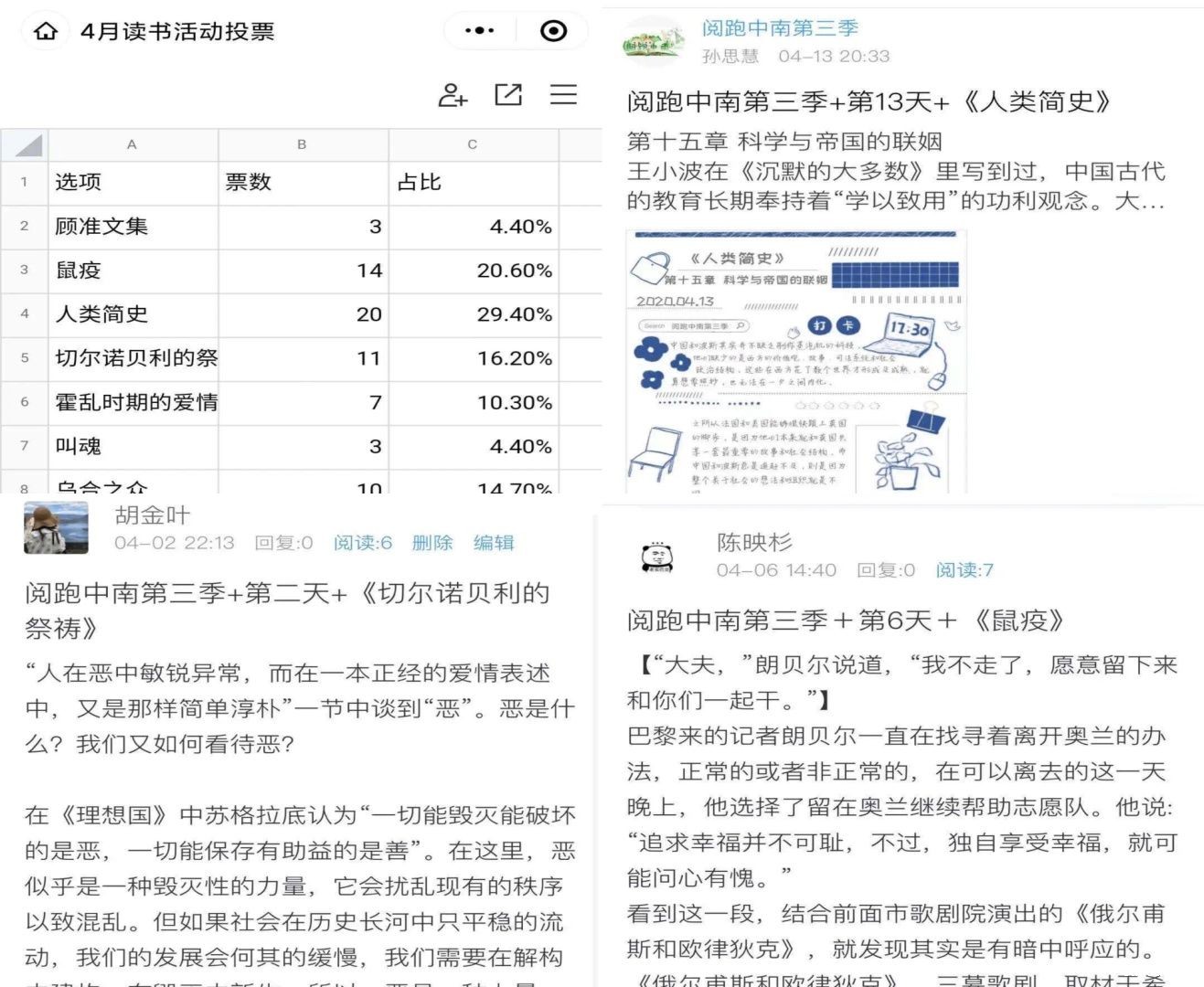 法窗读书会“月”读小组通过群内民主投票,最终任选得票数前三的书籍进行阅读。本次活动与校图书馆举办的“阅跑中南第三季”活动紧密结合,并在学习通每日进行阅读打卡。在共读的30天中,小组成员深入思考,积极分享讨论读书心得,做到读有所获。