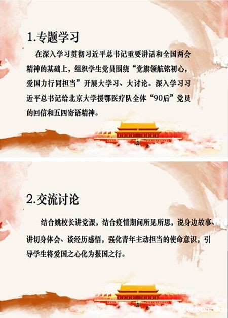 在大学习大讨论环节中,学生党支部王莎莎同志和施丽雅同志领学《习近平总书记给北京大学援鄂医疗队全体“90后”党员的回信》和《五四寄语精神》。总书记的寄语催人奋进,两位领学同志也号召大家主动担当,冲锋在前,锤炼专业本领,力争做出优秀的科研成果;同时积极参与志愿服务,将个人梦想融入时代潮流,将青春脚步紧随家国脉动,让青春绽放最为绚丽的光彩。几名同学结合姚校长微党课及疫情所见所思说出自己的感悟。抗疫志愿者代表刘玉玲同志在分享自己的志愿者经历之后表示,通过亲身经历自己明白作为一名党员、作为一名法律人应当承担的责任,也动员全体同学在面对危难时冲锋在前、学以致用,做一名合格党员。