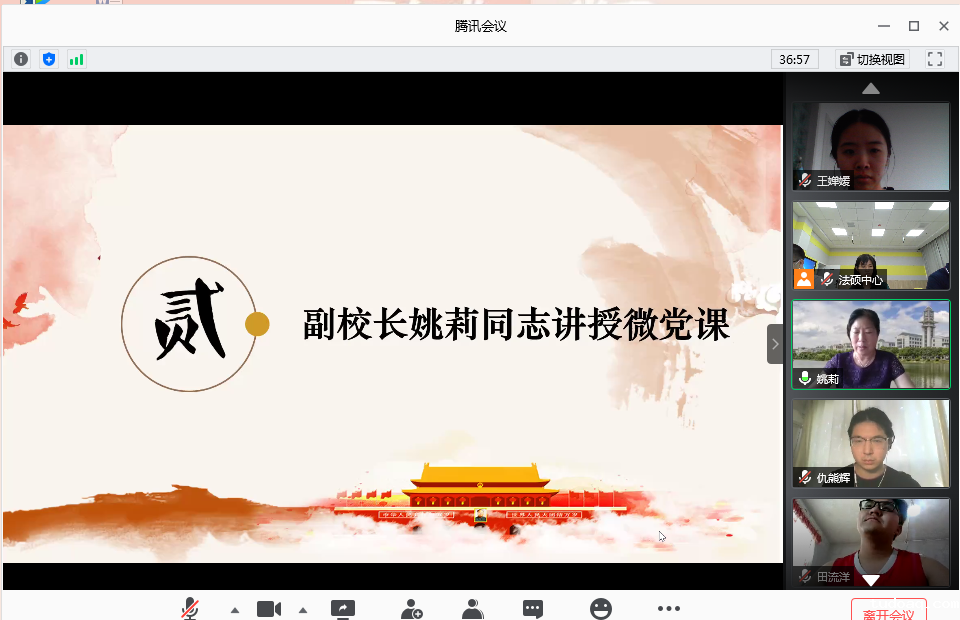 最后,易育同志表示今天的支部活动非常有意义,明天就是7月1日,党的生日。为了迎接党的生日,以“线上线下+微党课”的形式,开展了此次支部活动。微党课引导青年党员树立远大理想,知党、爱党、兴党,鼓励法硕学生德法兼修、成长成才,希望同学们能够坚定理想信念,志存高远,脚踏实地,砥砺前行,为实现中华民族伟大复兴的中国梦不懈奋斗!