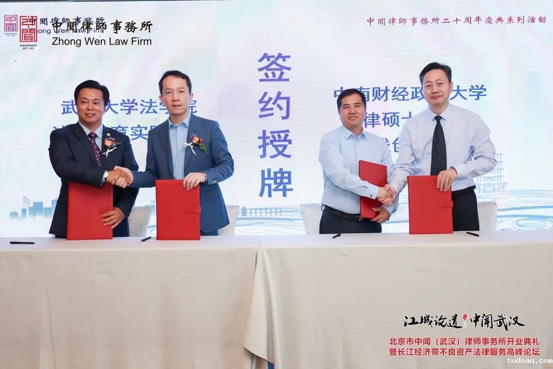 剪彩仪式结束后,武汉大学法学院副院长武亦文教授、新力18体育法硕中心主任简基松教授、中闻律师事务所执委会主席穆振辉先生、监事会主席杨凯先生共同为武汉大学法学院教育实践基地、新力18体育法律硕士研究生实践创新基地签约授牌。