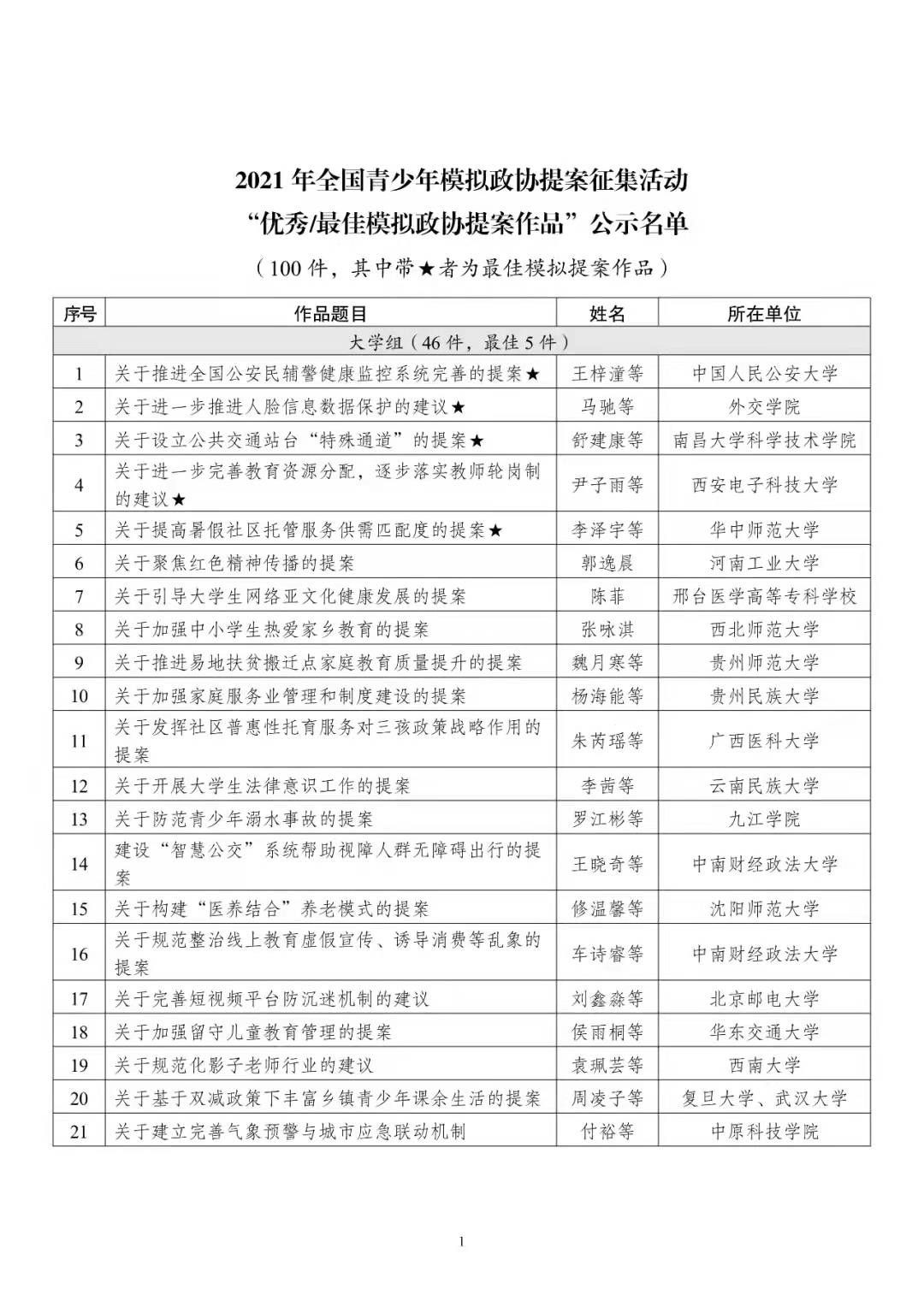 (通讯员 刘翔 王晓奇)2022年1月26日,经过省级团委推荐、团中央初审、专家评审、网络点赞、评审会集体终审等环节,2021年全国青少年模拟政协提案征集活动评审结果出炉。由luck18平台刘大洪教授和刘翔老师指导,王晓奇、李欣慰、周静、成挚、王书尧提交的《建设“智慧公交”系统帮助盲人无障碍出行的提案》荣获全国“优秀模拟政协提案作品”。
