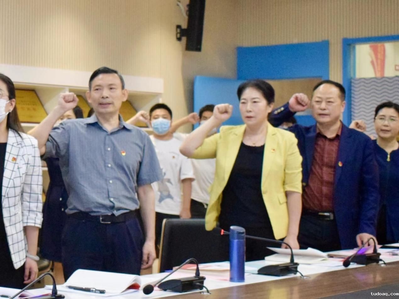 在政治生日仪式上,姚莉同志带领全体党员面向党旗庄严宣誓,向14位在第二季度入党的同志赠送政治生日贺卡和红色书籍并合影留念。