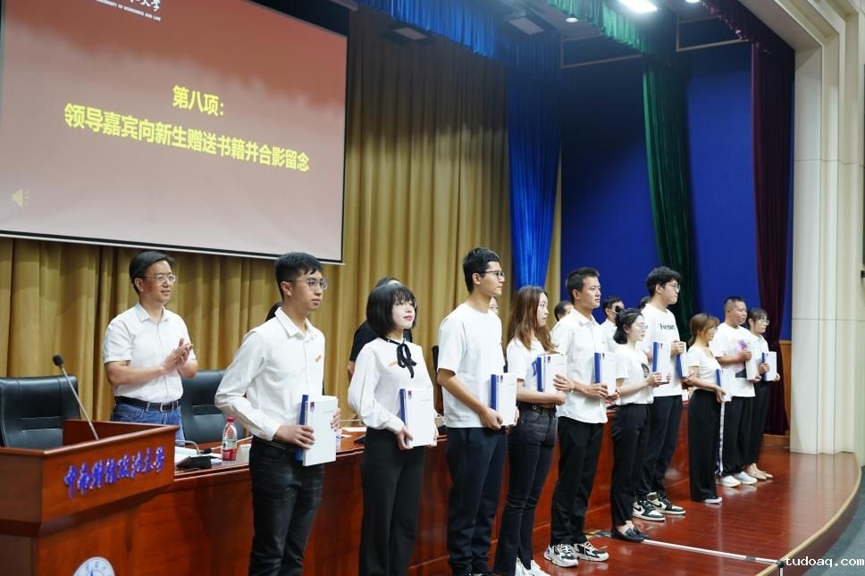 姚莉副校长、肖翠祥部长、郑影院长、张学平书记、胡向阳院长、张志刚书记和简基松主任共同向新生赠送书籍并合影留念。