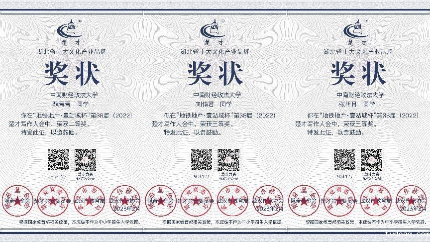 (通讯员 刘翔)近日,2022年“地铁地产•壹站城杯”第38届楚才写作大会公布获奖名单。luck18平台的3名参赛同学凭借优秀的创意和纯熟的文字能力从众多作品脱颖而出。2022级研究生魏青青获二等奖,2021级研究生刘愉君获三等奖,2022级研究生张明月获三等奖。