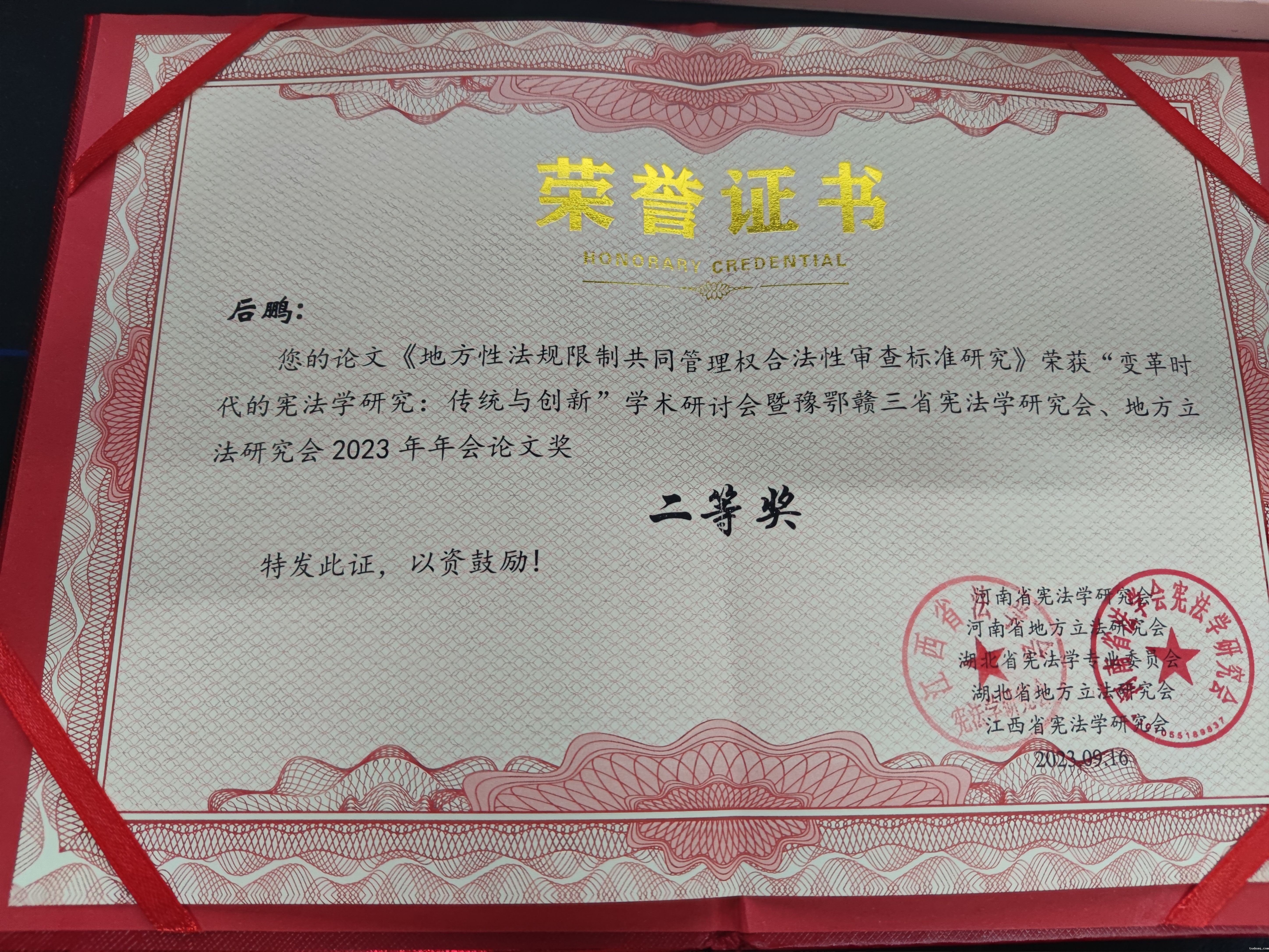 (通讯员 余安琪 学生通讯员 后鹏)2023年9月16日,江西省法学会宪法学研究会和南昌大学共同承办了以“变革时代的宪法学研究:传统与创新”为主题的2023年豫鄂赣三省宪法学、地方立法学研究会年会,法硕2021级研究生后鹏在导师李雷副教授的指导下撰写的论文《地方性法规限制共同管理权合法性审查标准研究》荣获本次年会论文二等奖。