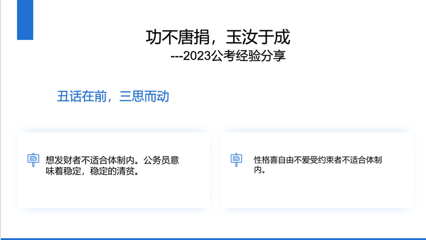 在向同学们分享备考经验之前,肖延辉首先介绍了体制内工作的优缺点。体制内工作的优点是工作稳定,除个别情况外都可以长久从事下去,且福利保障多;缺点是薪资待遇不如私企高,并且要处理复杂的人际关系。肖延辉表示,同学们要确定自己是否适合、喜欢这样的工作,三思而动。