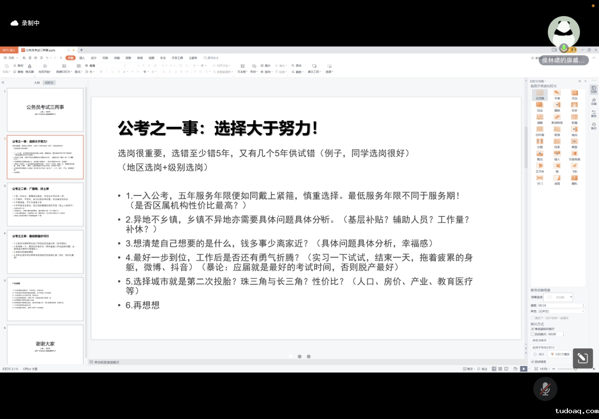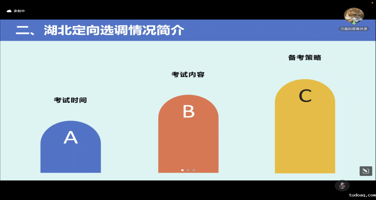 万磊主要从考试时间、内容和备考策略进行湖北定向选调的分享,推荐阅读党的二十大和政府工作报告,他重点介绍有关申论的备考经验、面试老师、公众号、做题攻略、名句积累等干货。他强调面试与笔试息息相关,笔试可以为面试打下基础。在准备面试时要勤于练习,在面试环节中要自信大胆。最后,万磊师兄分享了一些自己工作的心得,建议摆正心态,坚持学习同时不忘了学以致用,积极为人民服务。