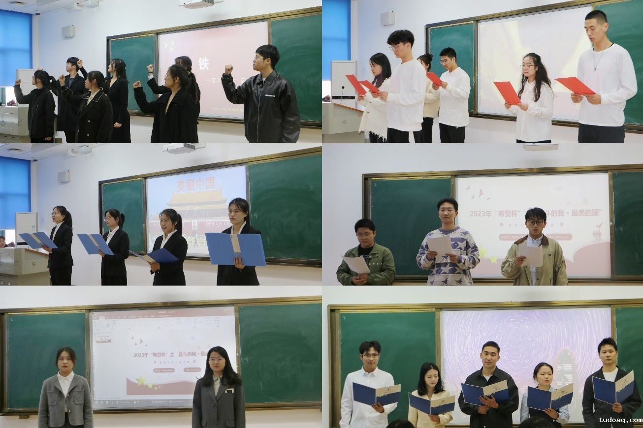 百年辉煌,砥砺初心。比赛开始后,共计十五组选手用真挚的情感、生动的表演歌颂了共产党人用智慧和汗水书写的壮丽篇章。第四组选手尚凡洁组带来作品《英雄》。英雄不仅是国家栋梁、行业翘楚,也是我们身边可爱可敬、可亲可感的榜样典型,新时代青年争做英雄模范,就是对英雄模范的最好致敬。第九组选手刘馨宜组以情景剧形式的演绎《青春时代》。以巴黎和会谈判失败为背景,九名同学真情呐喊,演绎出了那个年代的青年的慷慨激昂与家国情怀。第十组选手张婕组带来作品《红铁》。该诗中描绘的“红铁”象征了华夏儿女对党和国家的深切热爱之情,这块红铁,红得透明,红得凛冽,红得、像五万里的红绸,像五千年的日出,那是中国军人脚下,一寸山河一寸血的红,朗诵者眼含热泪的演绎感染了现场的观众们。
