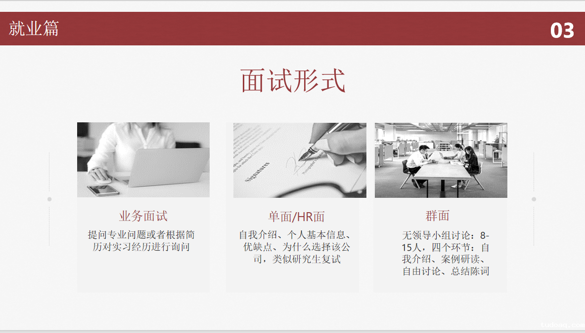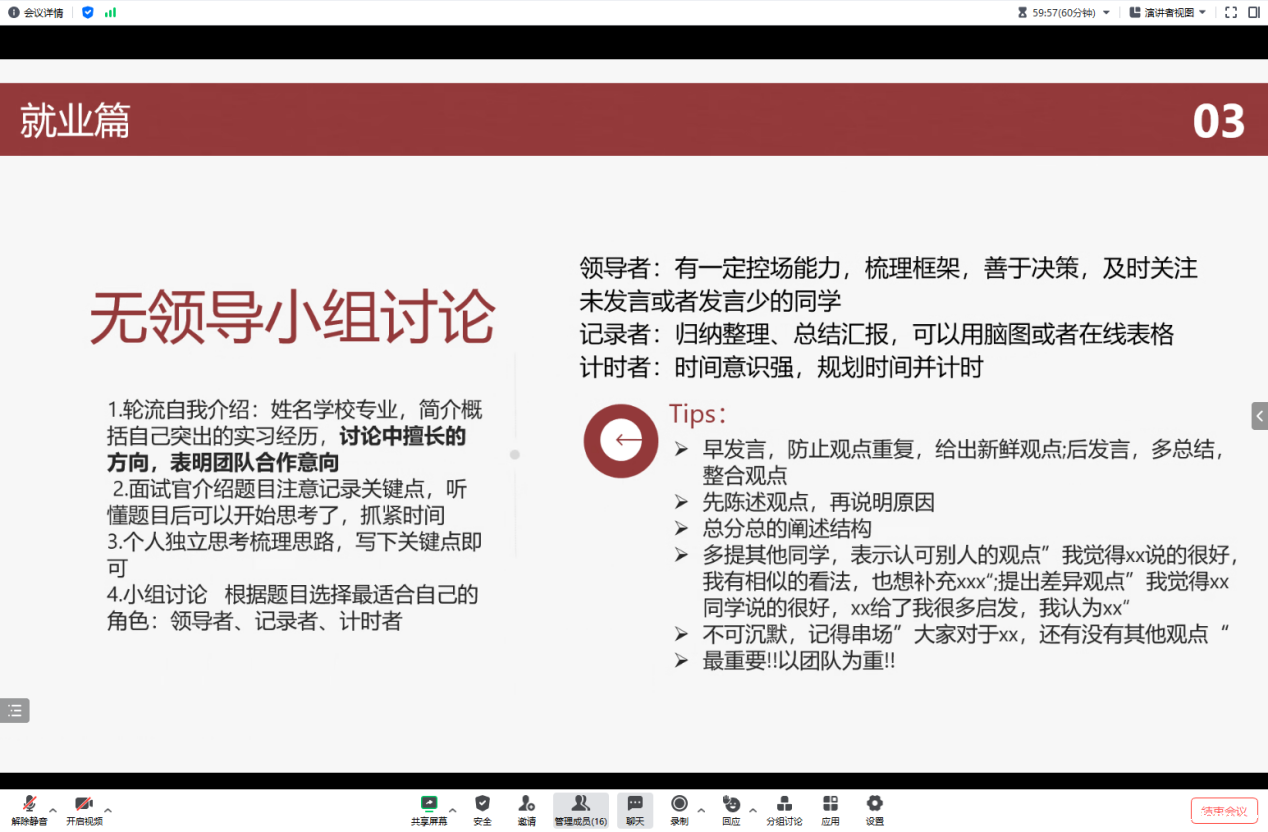 关于无领导小组讨论方面,她建议“在面试中早发言给出新鲜观点,后发言整合观点”。