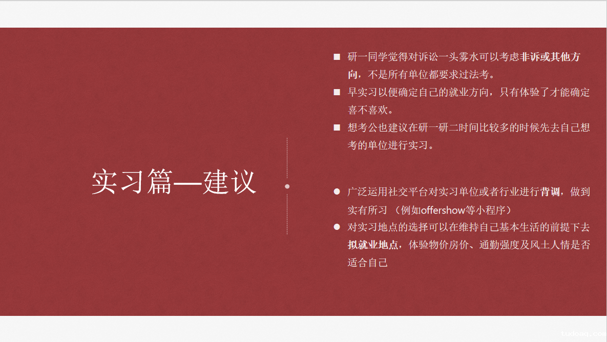 朱梅婷以实习经历、行业现状、求职技能为切入点,分阶段为同学们进行分享。关于实习方面,她认为,在研一、研二的时候就应确定自己的就业方向并利用闲暇时间去拟就业的单位实习,在选择实习单位时可以广泛运用社交平台进行背景调查,做到“实有所习”。