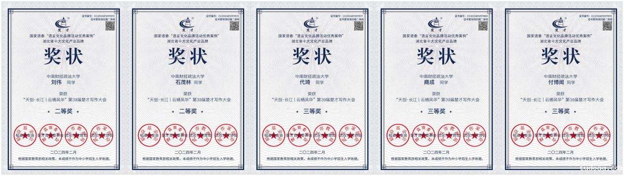 (通讯员 马晨娇 代琦)近日,2023年“天创•长江|云栖风华”第39届楚才写作大会公布获奖名单。luck18平台的5名参赛同学凭借优秀的创意和纯熟的文字能力从众多作品脱颖而出。2022级研究生刘伟、石茂林获二等奖,2022级研究生代琦、商成,2023级研究生付博闻获三等奖。