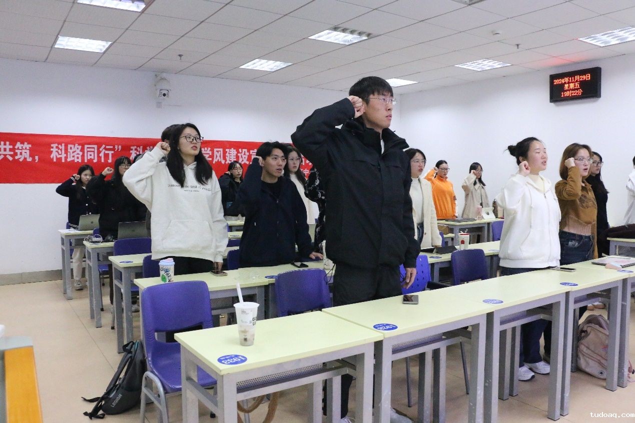 最后,全体研究生起立,举起右手,郑重地进行学风道德宣誓,洪亮而坚定的宣誓声在活动现场久久回荡。学风道德宣誓不仅仅是一句句简单的口号,更是每一位同学发自内心的庄严承诺。在今后的学术生涯中,无论面对何种诱惑,都要坚守初心,用实际行动践行今日的誓言,守护学术的尊严和纯洁。