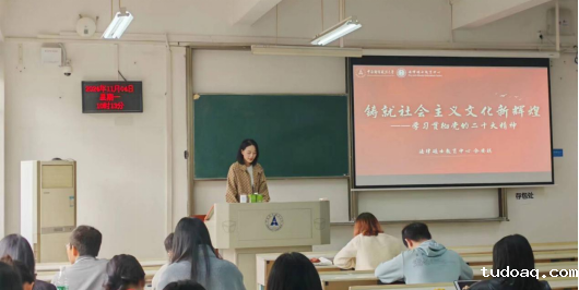 余安琪老师以“铸就社会主义文化新辉煌——学习贯彻党的二十大精神”为题,围绕党的二十大精神展开论述,敦促同学们要学好学深、悟透悟实党的二十大精神,并以社会主义文化为切入点,带领同学们观看了中华文明专题视频,增强了同学们的文化自信。