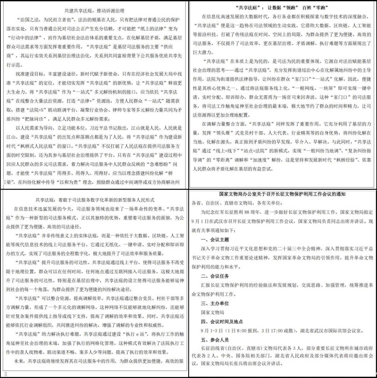 赵馥的公文以《共建共享法庭,推动诉源治理》为主题,提出将共享法庭作为基层司法服务的主要“供应商”,并丰富建设途径,以此满足基层群众司法需求。赵开心的公文以《“共享法庭”:让数据“领跑”百姓“零跑”》为主题,主要提及借助大数据等前沿科技,打破传统法庭局限,提供便捷、高效的司法服务。 并指出需要整合调解力量,解决执行难问题,以此展望未来共享法庭建设的深化和完善。杜崇源的公文以《共享法庭:着眼于司法服务数字化革新的新型服务人民形式》为主题,介绍了共享法庭作为新型的司法服务模式,重塑了司法服务面貌,提供了便捷、高效的司法途径。并强调了共享法庭在就地化解纠纷、提供专业法律服务等方面的优势。郑文洁的公文主要内容是《国家文物局办公室关于召开长征文物保护利用工作会议的通知》,详细安排了会议的任务、时间、地点及参会人员等事宜。